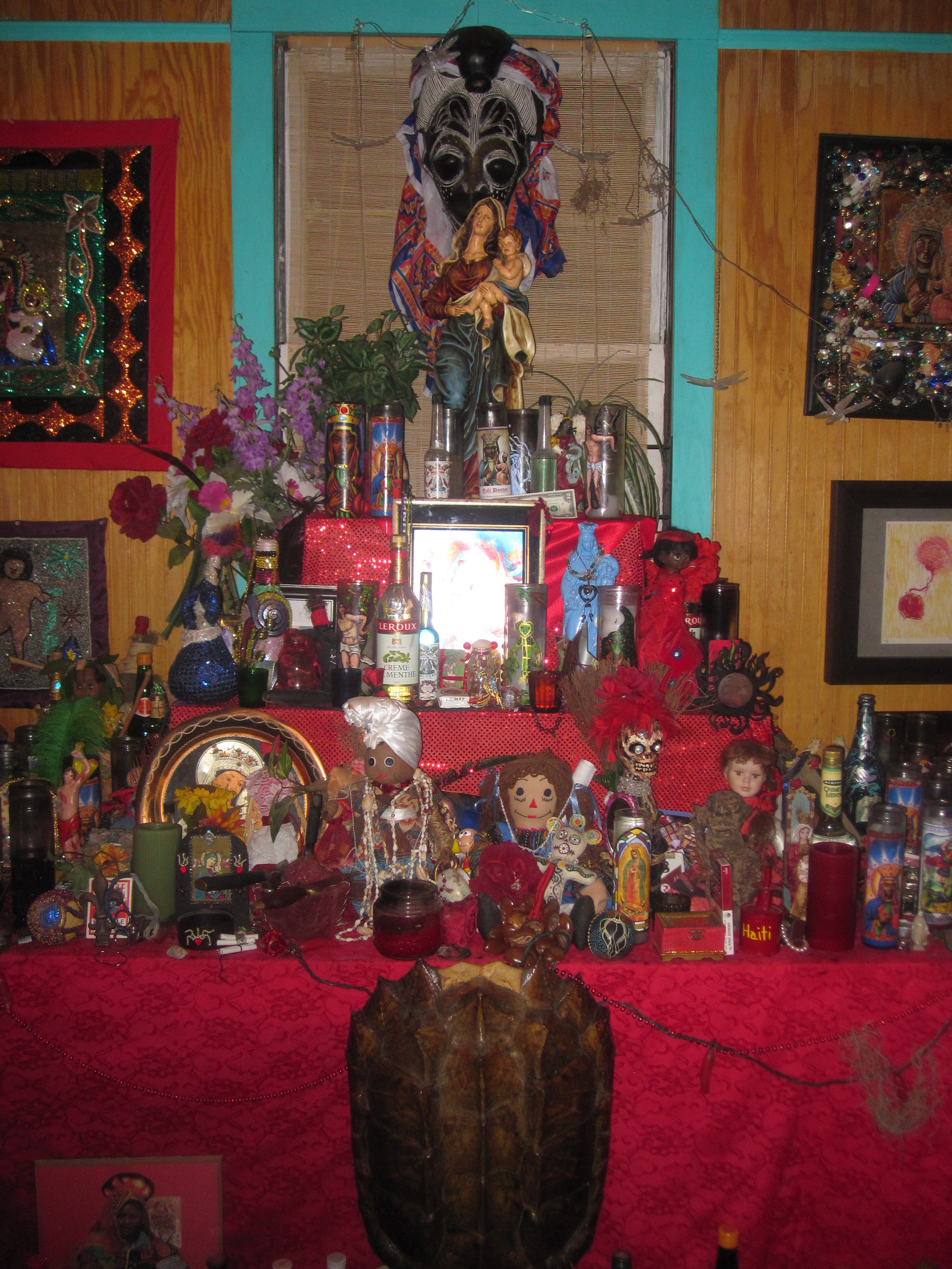 So, of course I had to talk to Sallie Ann, right? The Island of Salvation Botanica is on the edge of the Ninth Ward and crammed full of… stuff. The temple room has candles, statues, booze, cigars, altars and just things everywhere. Apparently voodoo spirits (and there are a ton) like to party.